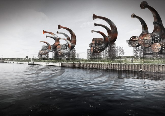 Όπως διαβάσαμε στο designboom, το έργο αποτελείται από 12 μεγάλες κόρνες που θυμίζουν εκείνες των Βίκινγκς και λειτουργούν με τουρμπίνες αέρα για να παράγουν ενέργεια και παράλληλα ήχους.
